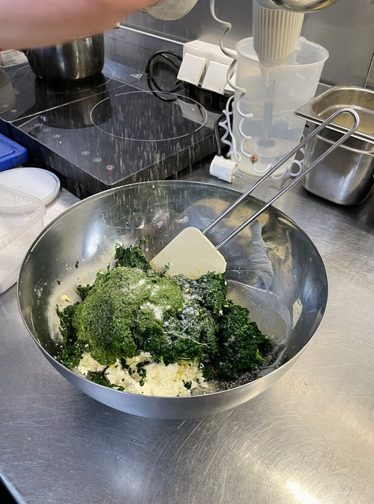 Blanchierten Bärlauch fein schneiden und mit Ricotta, etwas Topfen, Butter, Dotter, Grieß und Brösel vermengen. Mit Salz, weißem Pfeffer, Muskatnuss sowie etwas Zitronenschale und -saft würzen, damit die Frische des Bärlauchs perfekt zur Geltung kommt. Kurz ruhen lassen, damit die Masse gut bindet und später nicht aus den Tascherln austritt.