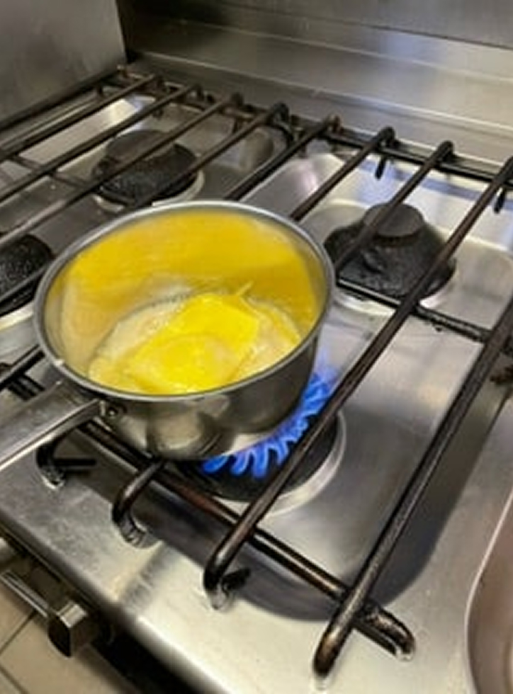 Butter langsam schmelzen und erhitzen, bis sie goldbraun wird und herrlich nussig duftet. Vom Herd ziehen und durch ein feines Sieb gießen. Diese aromatische Butter verleiht den fertigen Tascherln einen warmen, runden Geschmack und macht das Gericht besonders edel.